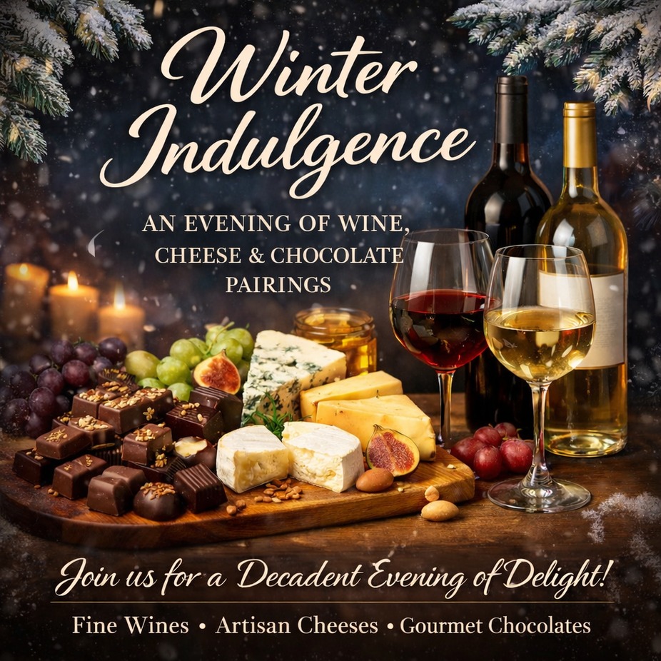 Embrace the season with an evening of rich flavors and cozy elegance at The Loyalist Market. This curated tasting experience brings together four hand-selected wines, thoughtfully paired with four artisanal cheeses and four decadent chocolates, designed to highlight how these indulgent favorites elevate one another.
